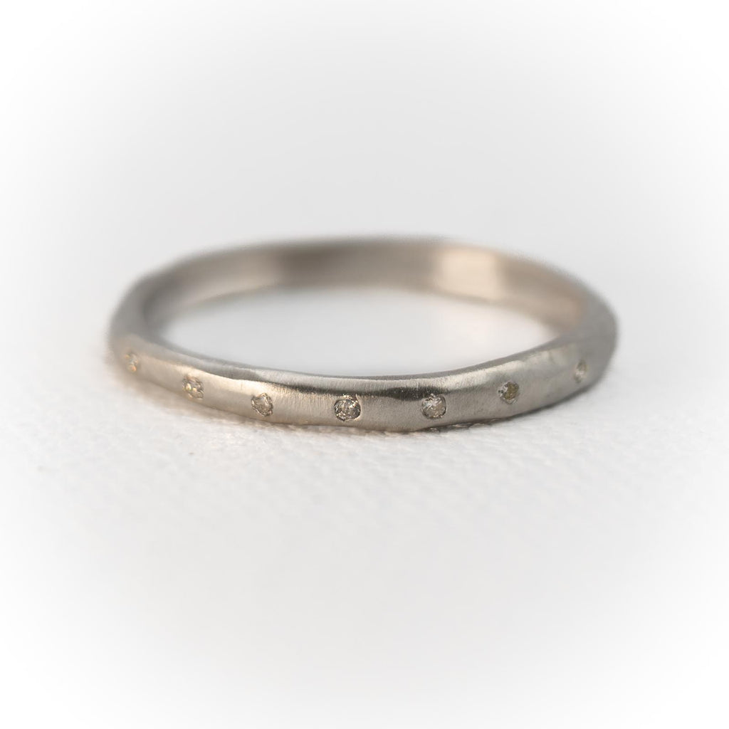 With the high popularity of our gold seven across rings here and on the Sundance catalog, we were prompted to make a version in sterling silver with a more affordable different look. With an organic hammered texture band and seven small shimmering diamonds, this ring stacks gracefully and is comfortable to wear in any setting.